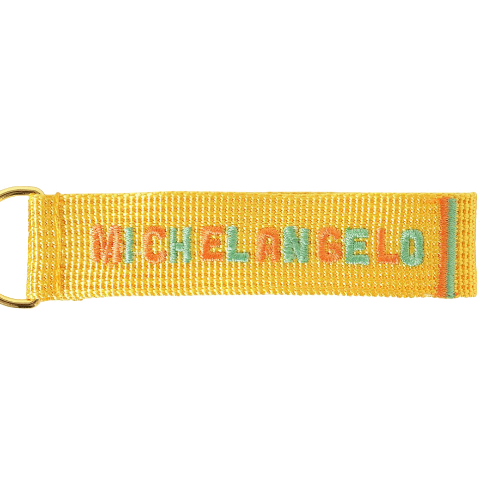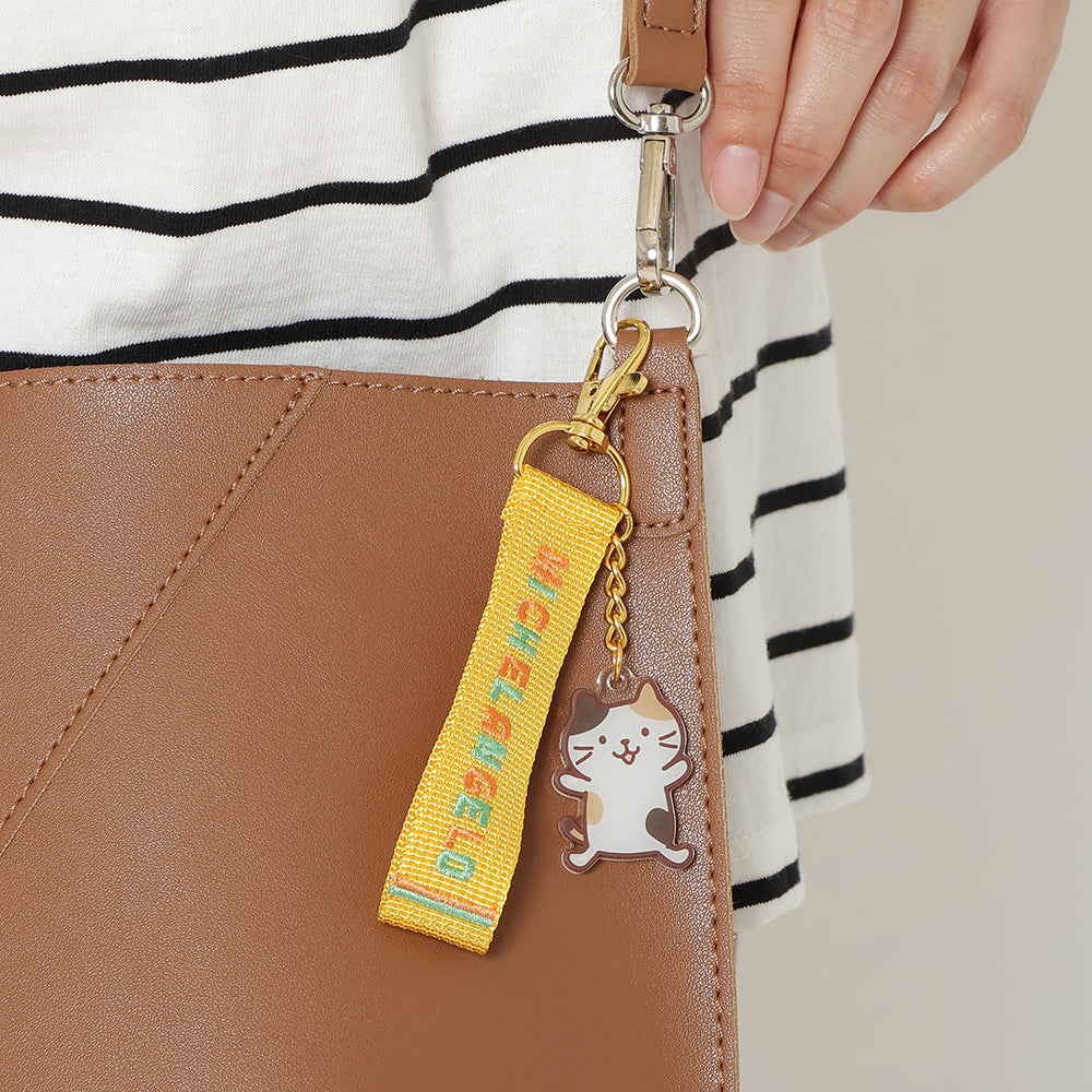にゃんこのイメージカラーの生地に名前が刺繍された特別感のあるキーホルダー。