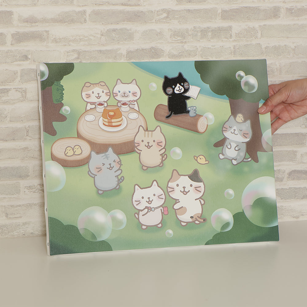 木製フレームに張られたキャンバスの仕様。ふくふく島で暮らすにゃんこたちをデッサン風に書き上げた、こだわりのネコの日限定デザインです。