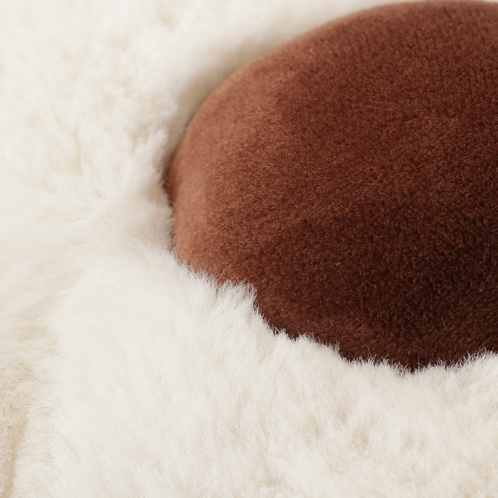 表面はふわふわ、裏面はスーパーマイクロ生地でなめらかな肌触り。両面で違った感触を楽しめて、ふわふわの毛並みにもちもち肉球の感触がたまりません。肉球の裏面には、大好きなチーズ煮干しを頬張っているかわいいミケランジェロのアップリケ入り。