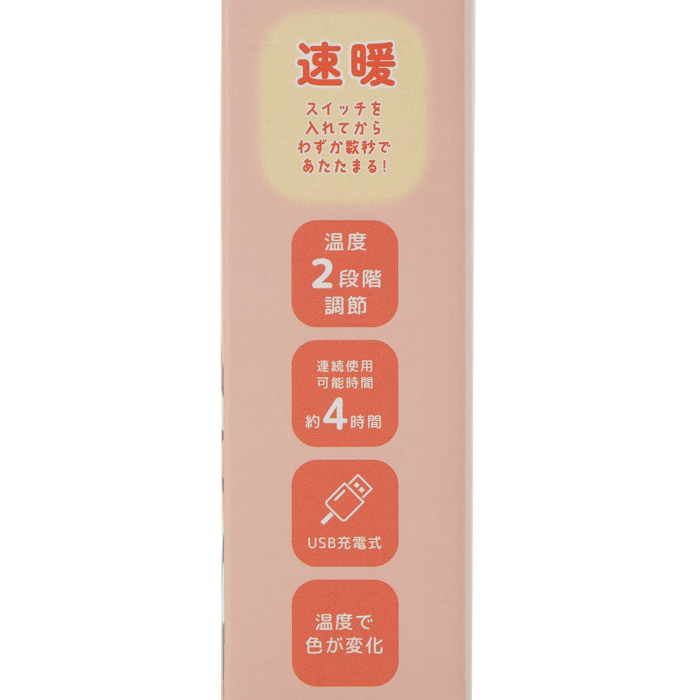 | 機能特性 | 電源 DC5V 0.7A 消費電力 3.5W 充電電池 リチウムイオンポリマー電池 3.7V2000mAh 充電時間(約) 4時間 満充電時の合計使用可能時間(約) 2.5時間(強)~4時間(弱) (室温25℃時) 設定温度(約) 2段階:強/50℃、弱/40℃(±5℃) 電源コード(約) USBコード:750mm(Type-C) |