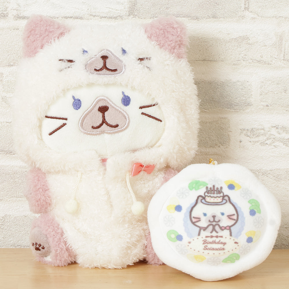 実は…おすわりマスコットに合わせられるサイズ感になっています!金具部分は本体から外せるので、持ち歩きだけでなく一緒にぬい撮りも楽しめるバースデーアイテムです。