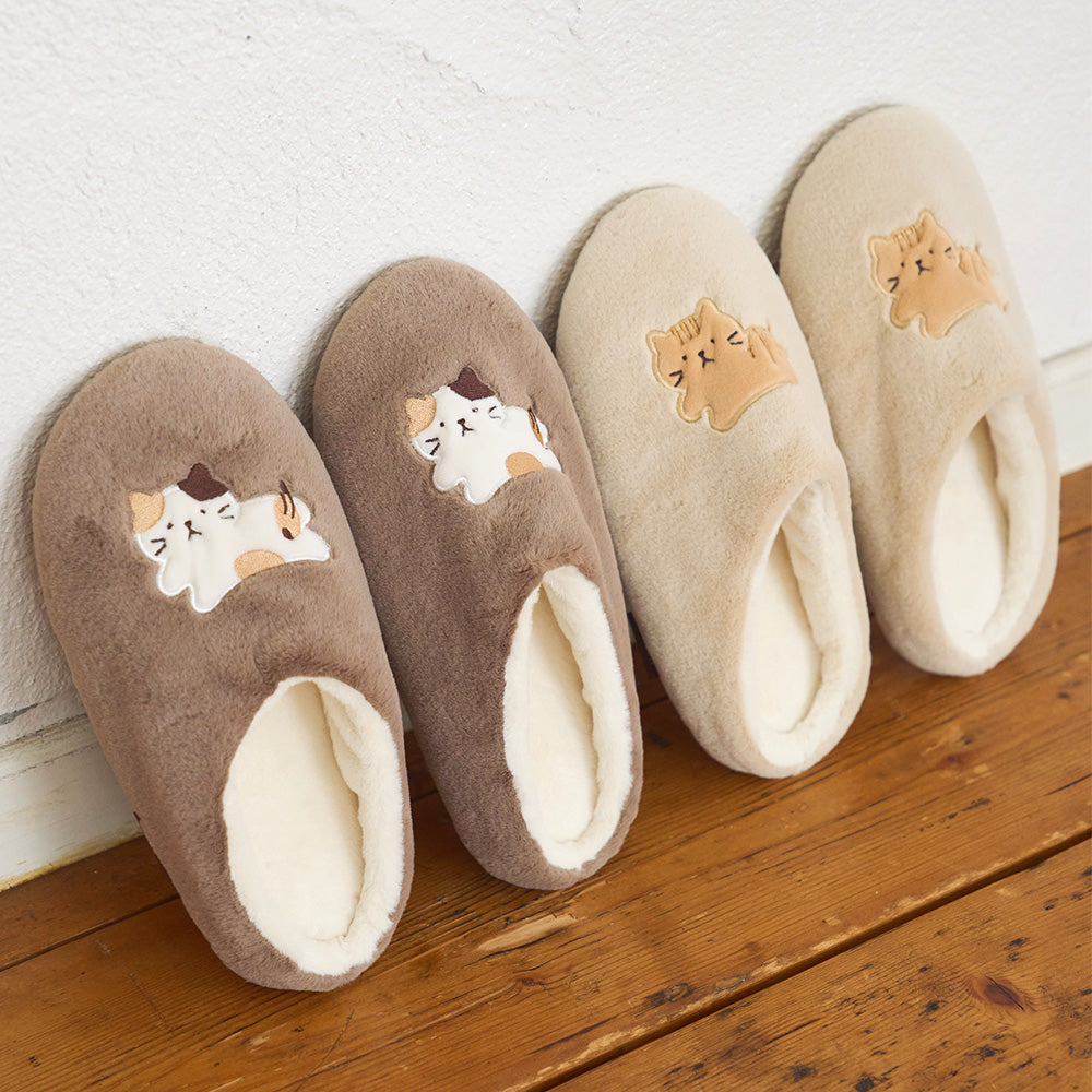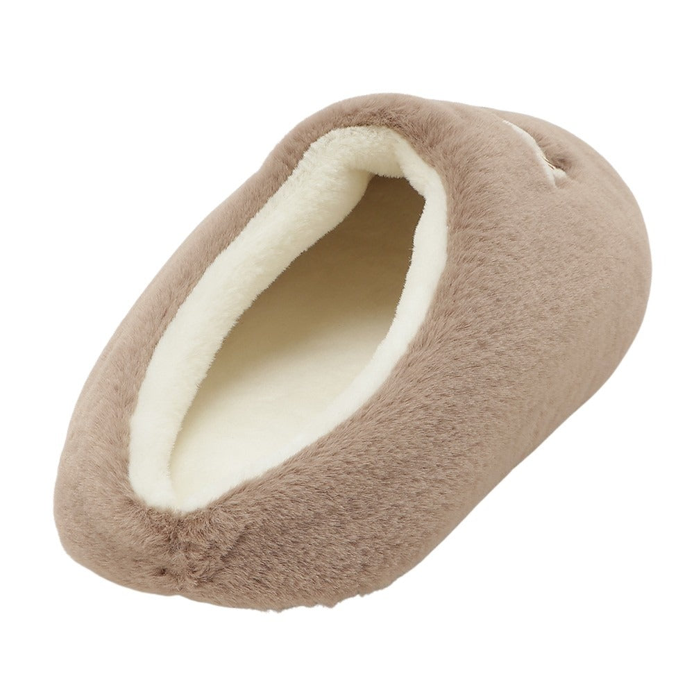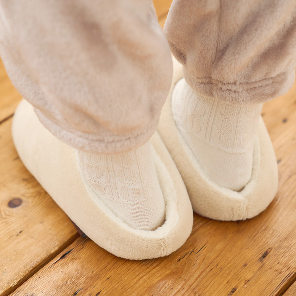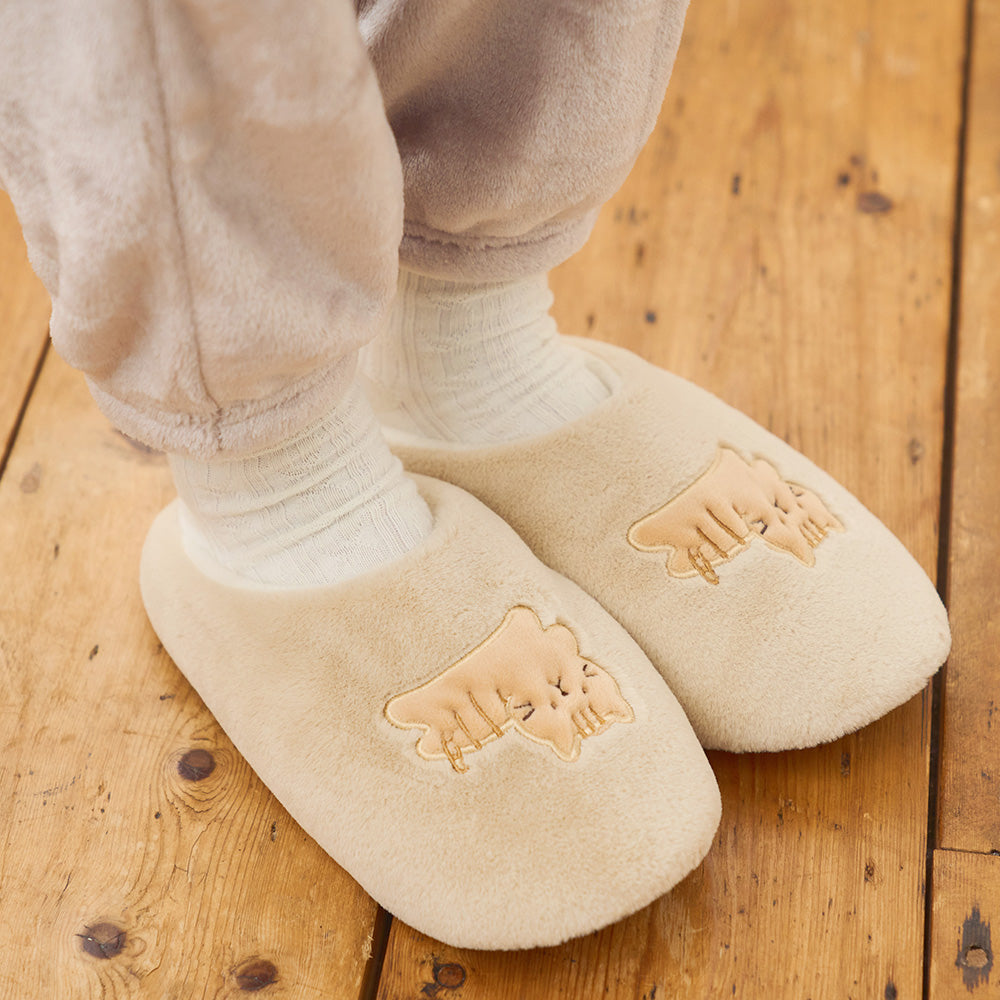 足の甲をすっぽり包むので、冬でもあたたかく過ごせるルームシューズです。底面には安心のすべり止め付き。