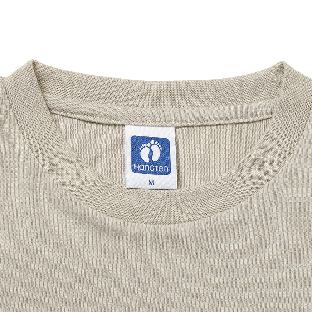 三毛猫のミケランジェロがサーフィンに挑戦しているかわいい絵柄です。胸元には、Hang Tenの足跡ロゴが刺繍されています。