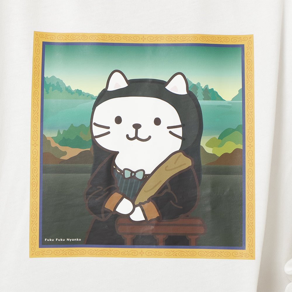 パロディ感があるかわいいデザインのロングTシャツがふくにゃんから登場。しろたまちゃんモナリザとミケランジェロの真珠の耳飾り。