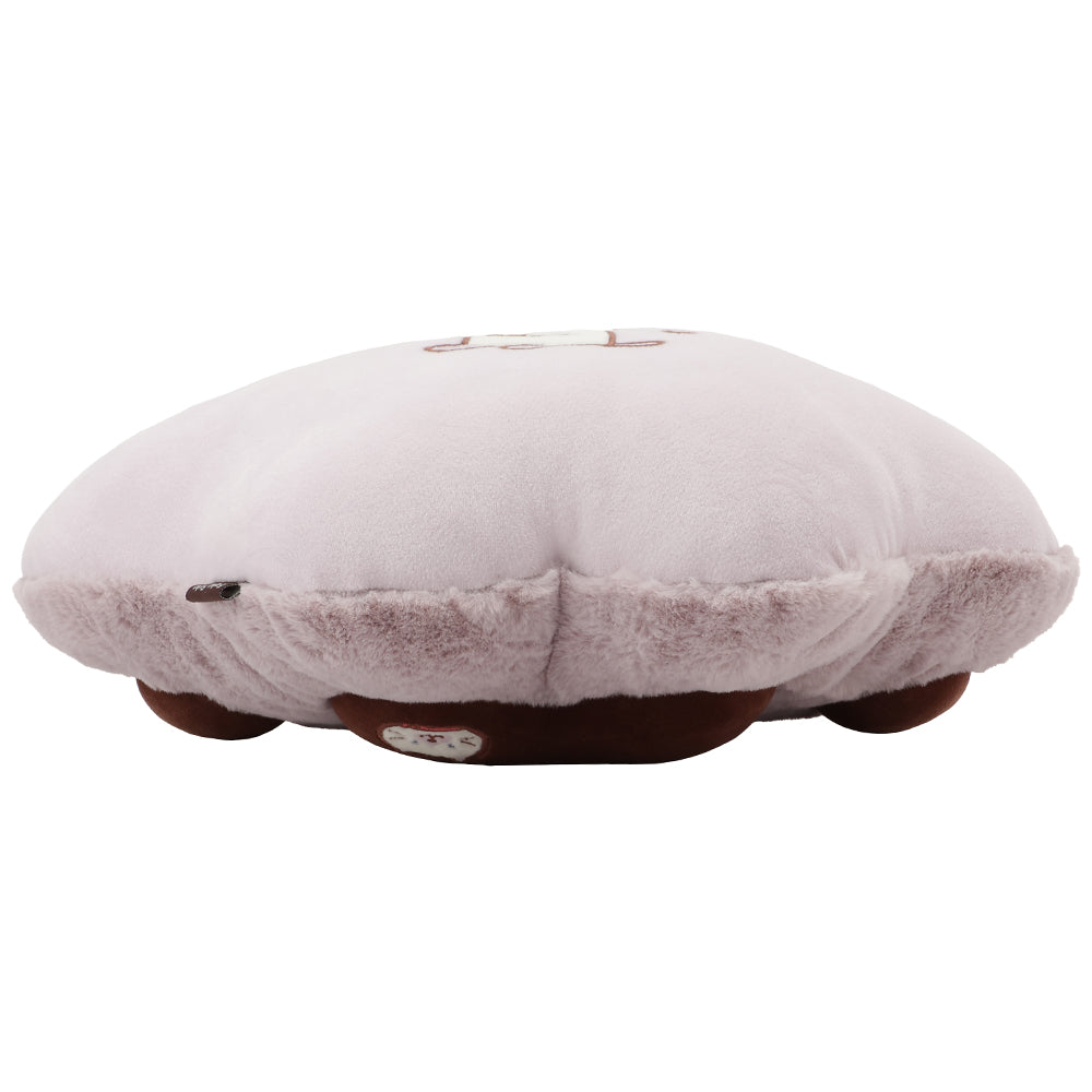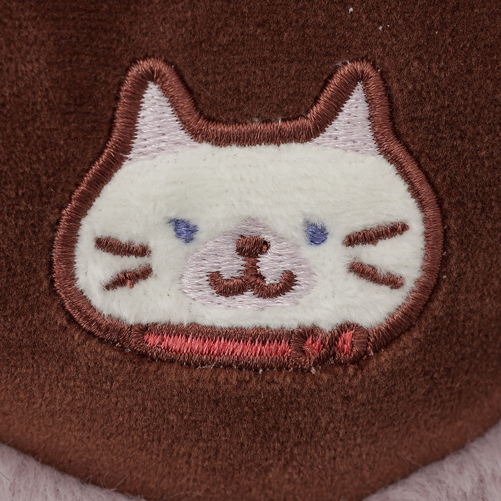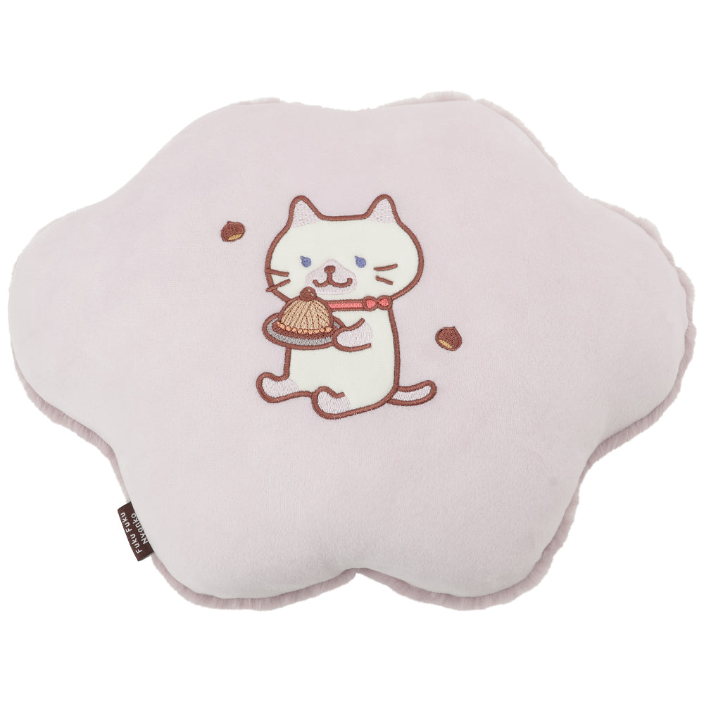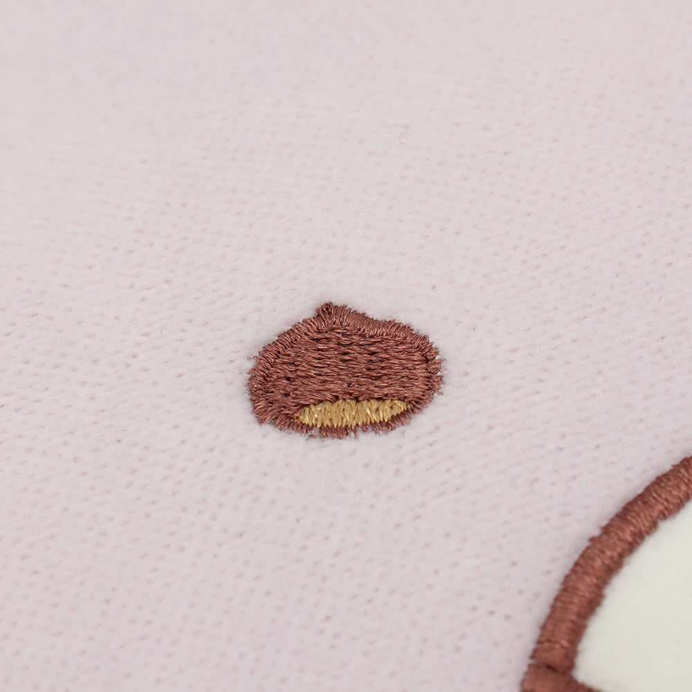 表面はふわふわ、裏面はスーパーマイクロ生地でなめらかな肌触り。両面で違った感触を楽しめて、ふわふわの毛並みにもちもち肉球の感触がたまりません。肉球の裏面には、大好きな栗のモンブランをおいしそうに見つめるかわいいシャーシャのアップリケ入り。