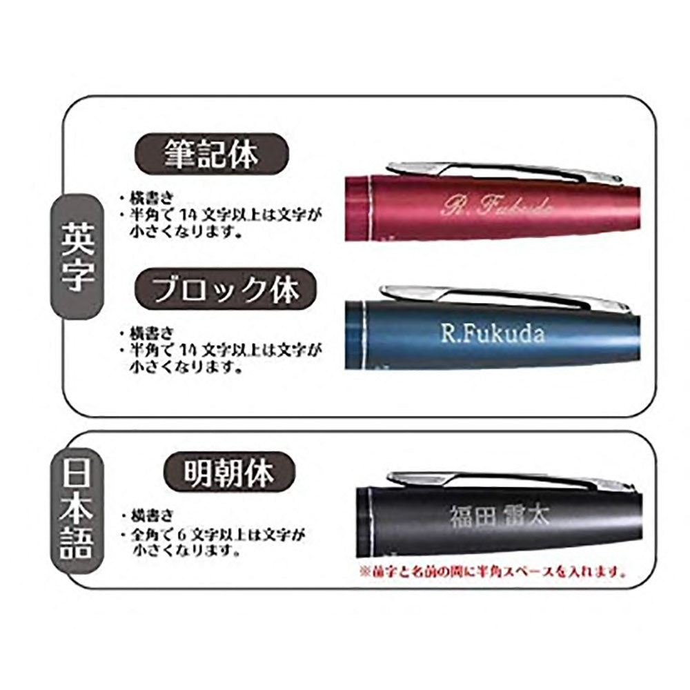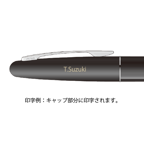 落込み嵌合式/キャップ式 名入れ:軸・キャップ(レーザー空彫、シルク印刷)、中間胴(シルク印刷) |