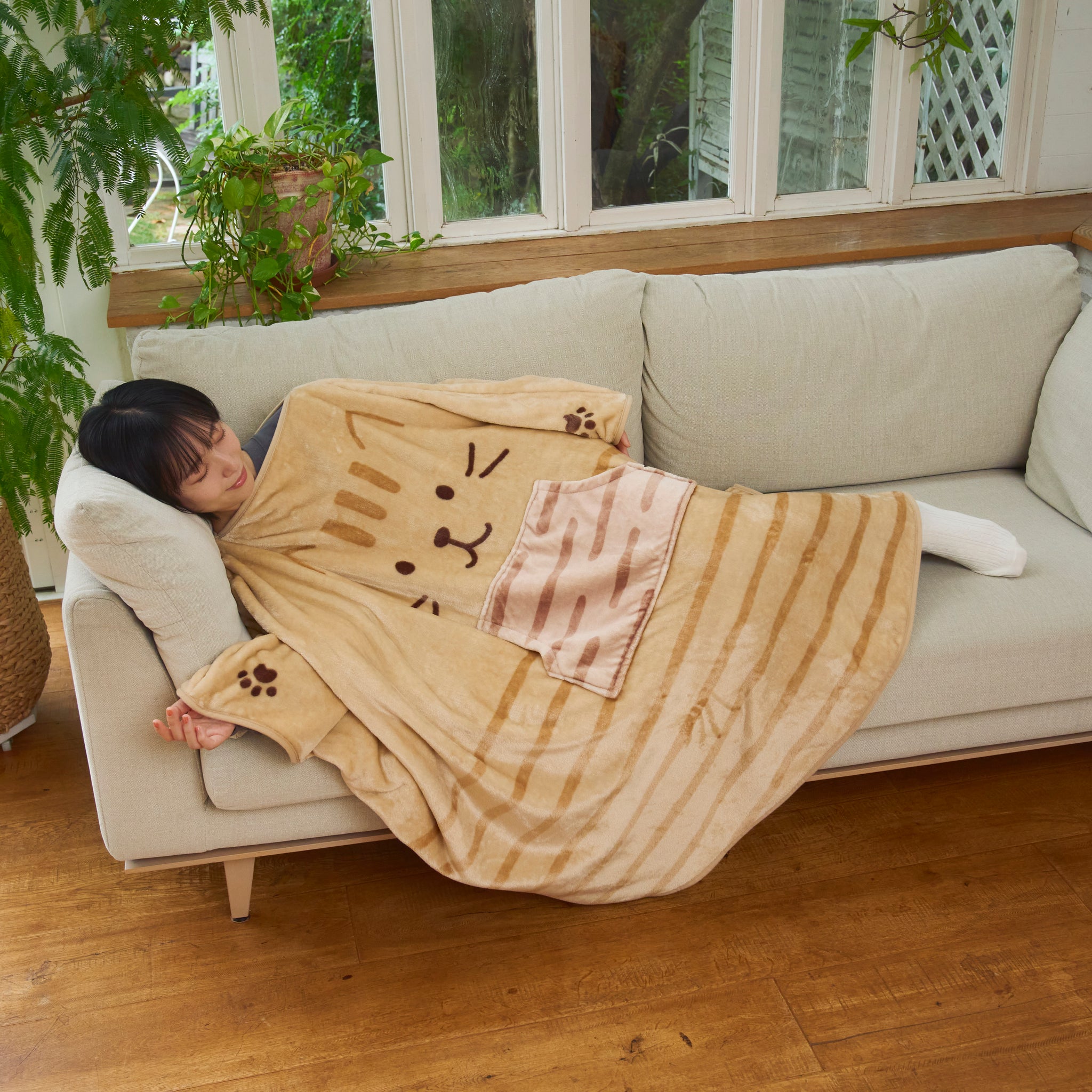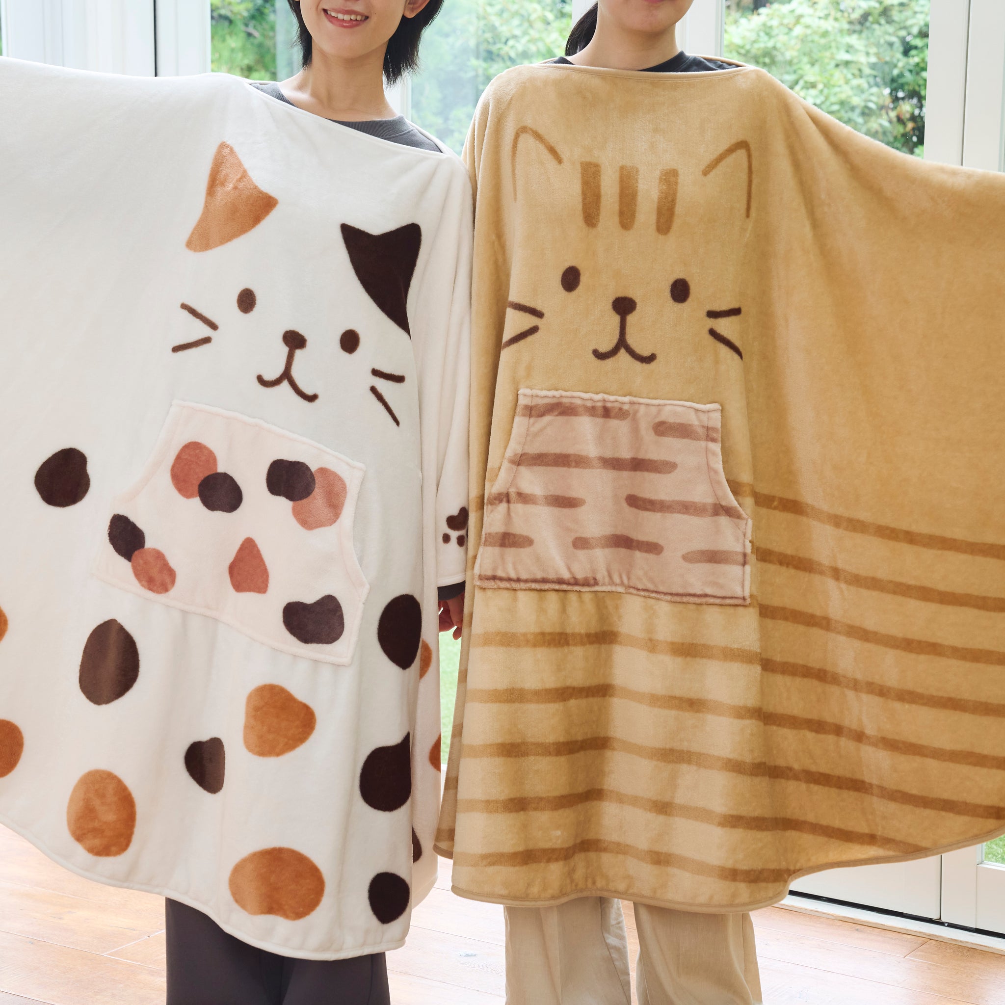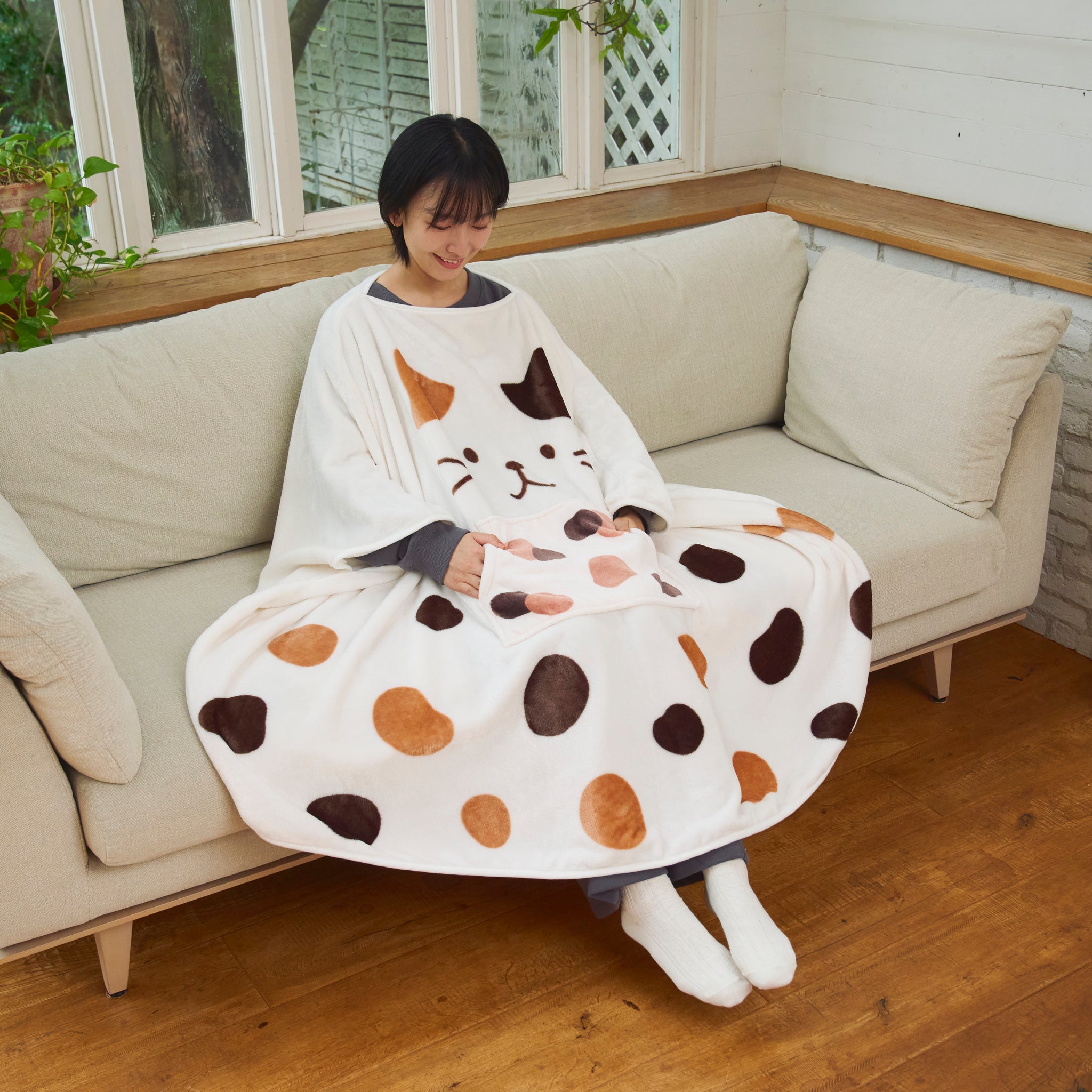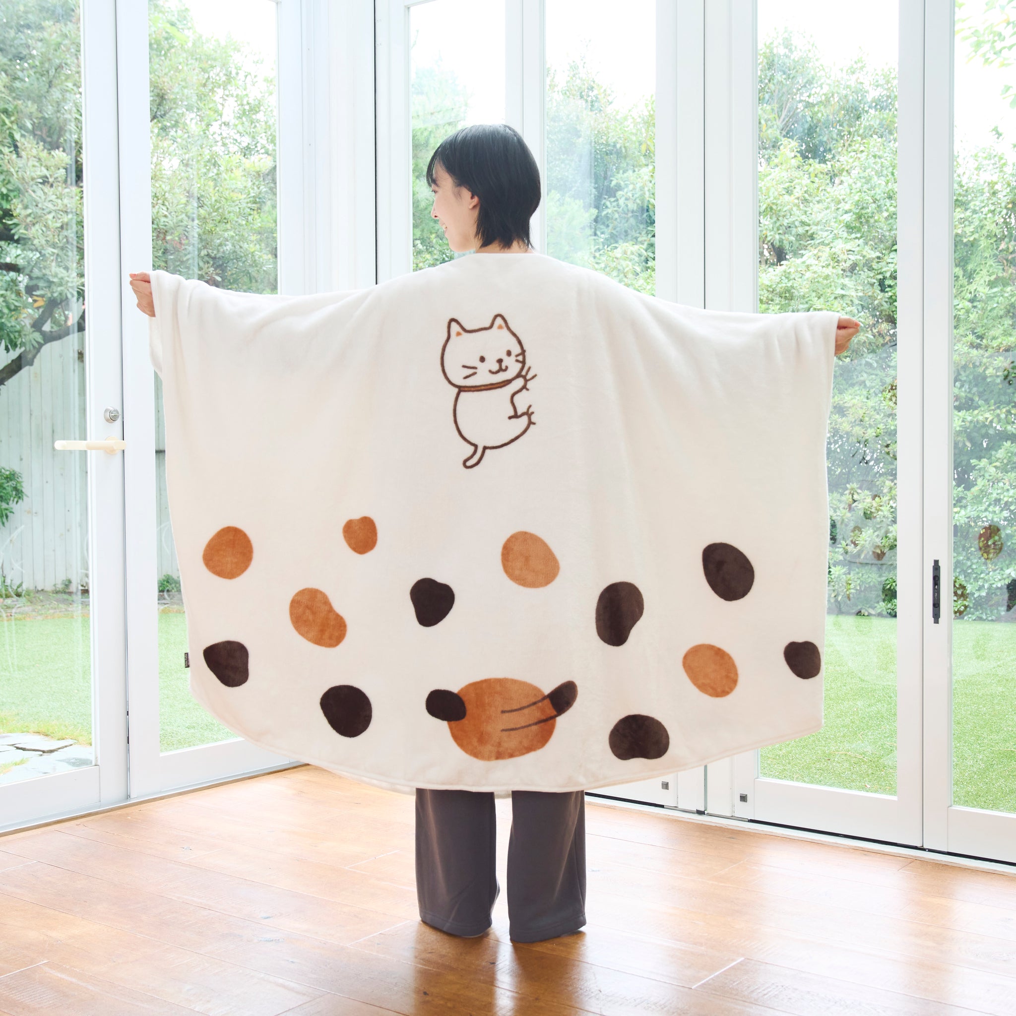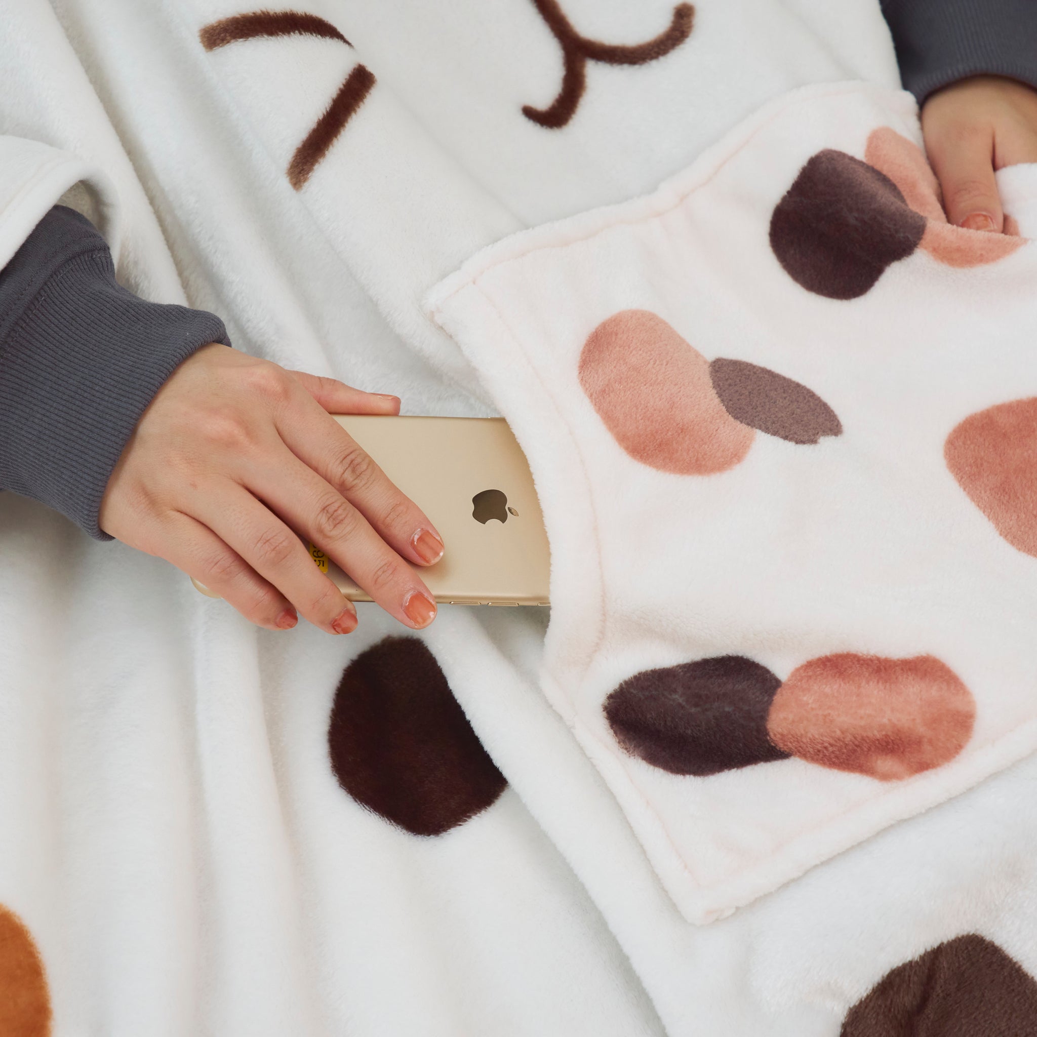 袖先にはキュートな肉球デザインがついていて、まるでにゃんこを着ているようなかわいさ!ふんわりあったか素材で、寒い冬の日もぽかぽか快適に過ごせます。猫好きさん必見の癒し系着る毛布です🐱✨